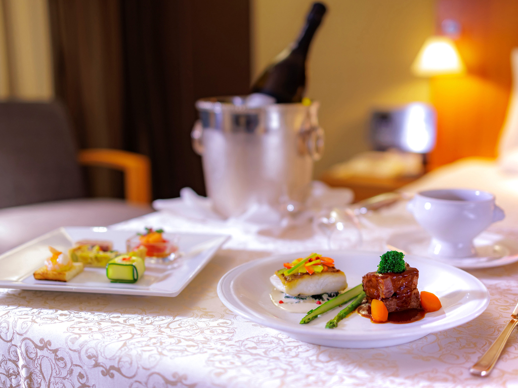 夕食はルームサービスにてディナーコースをご用意いたします。