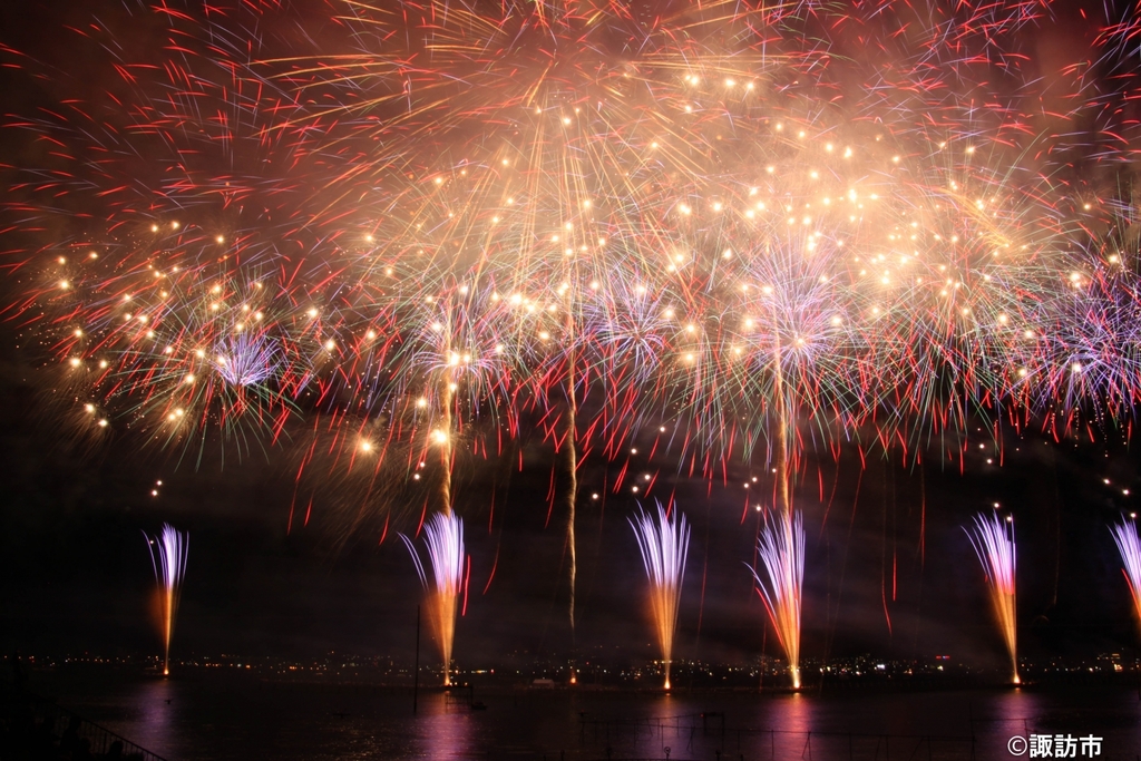 日本有数の規模を誇る「諏訪湖祭湖上花火大会」。湖面に映る花火と夜空の競演は、一度見たら忘れられない絶景です。