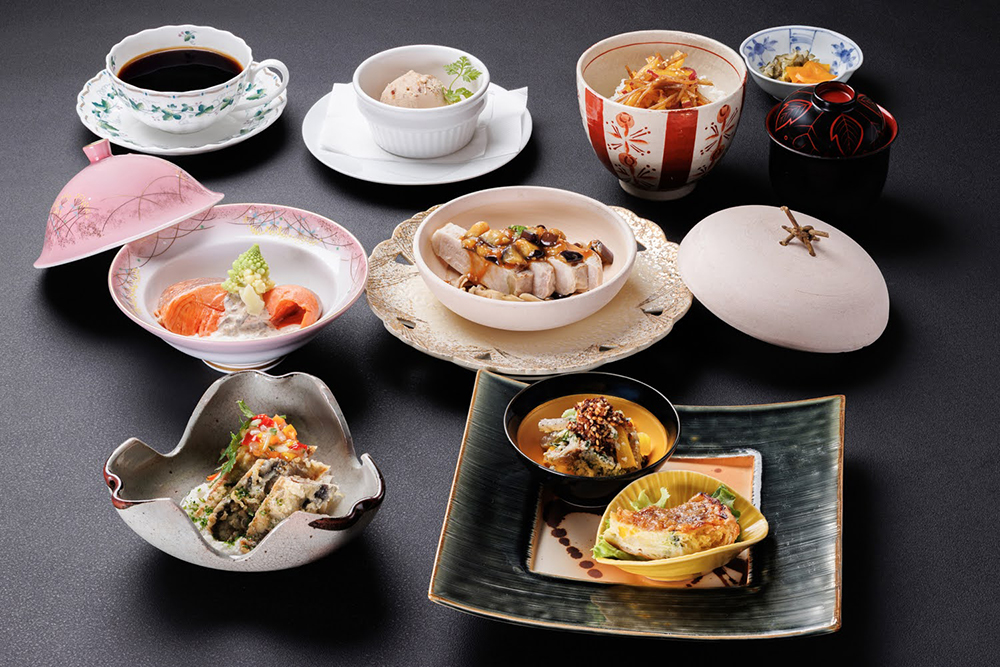 ・無花果と茸の香り豊かなキッシュ ・柿と菊菜の秋彩白和え ・秋鮭の白ワイン蒸し 〜デュクセルのソースを添えて〜 ・三元豚と茄子の味噌香焼き ・秋刀魚磯辺揚げ南蛮仕立て 〜とろろ掛け〜 ・薩摩芋の金平ご飯 ・香の物 ・味噌汁 ・栗のアイスクリーム 季節の風味 ・珈琲