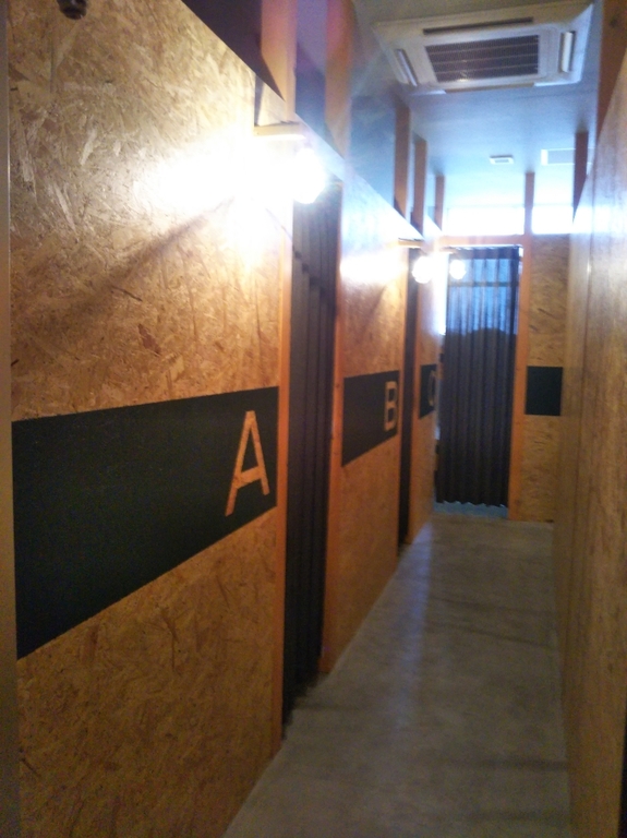 ・9名収容の男女相部屋です。個々スペースは簡易壁とカーテンで分けれらています。