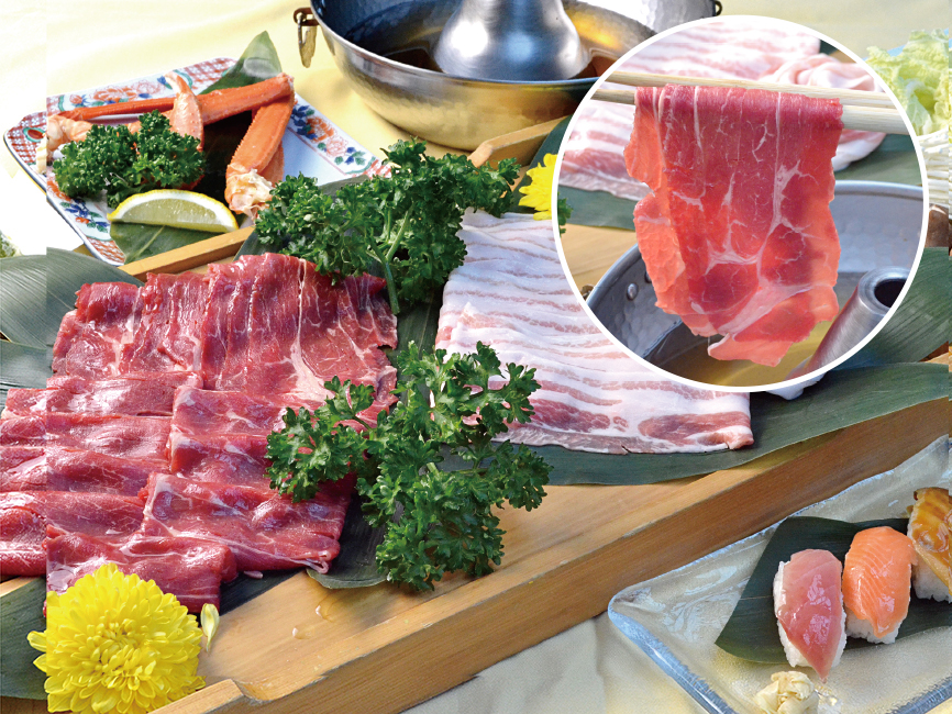 温泉で疲れを癒したあとは、厳選お肉と旬野菜を、心ゆくまでしゃぶしゃぶで。