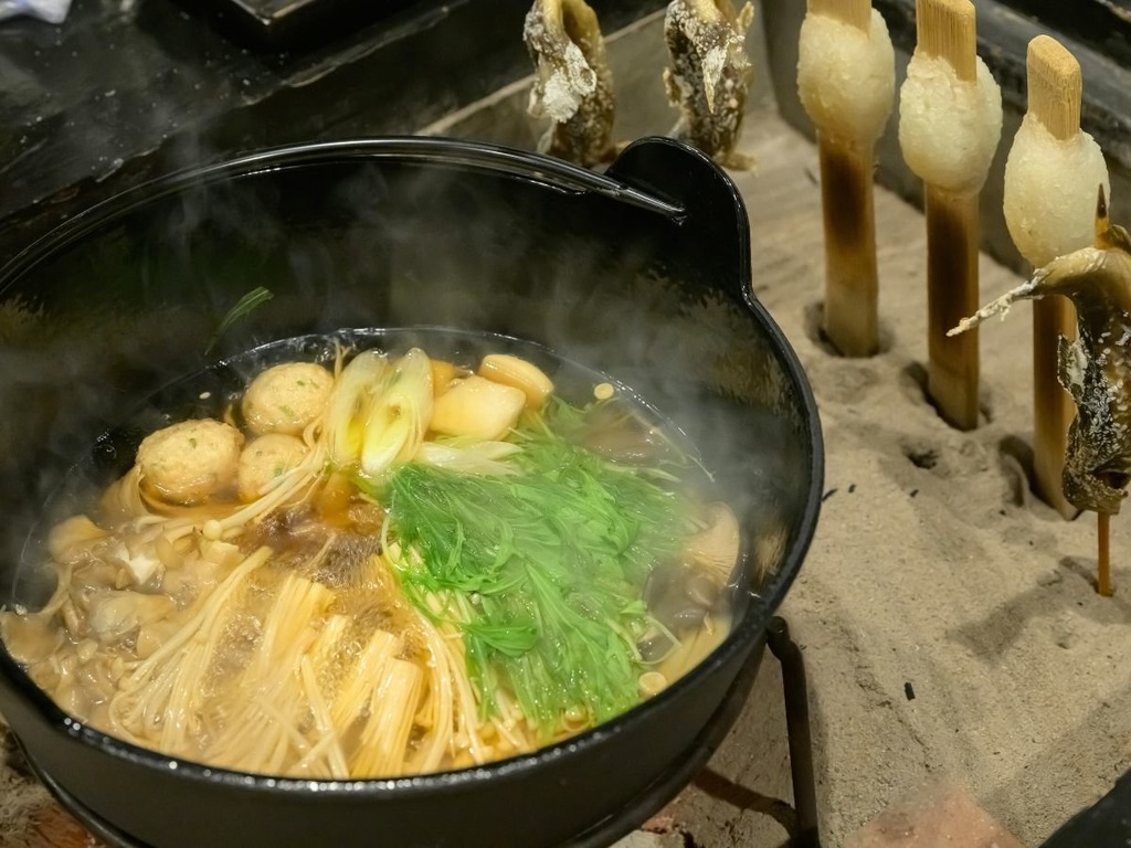 夜は炭火が香る炉端焼きと源泉かけ流しの温泉で心も体もポカポカに。
