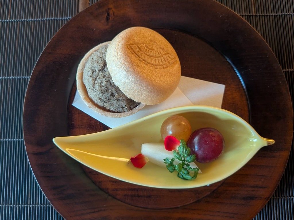 餅草豆腐、サーモン寿司、紅芯大根と生姜の甘酢漬け